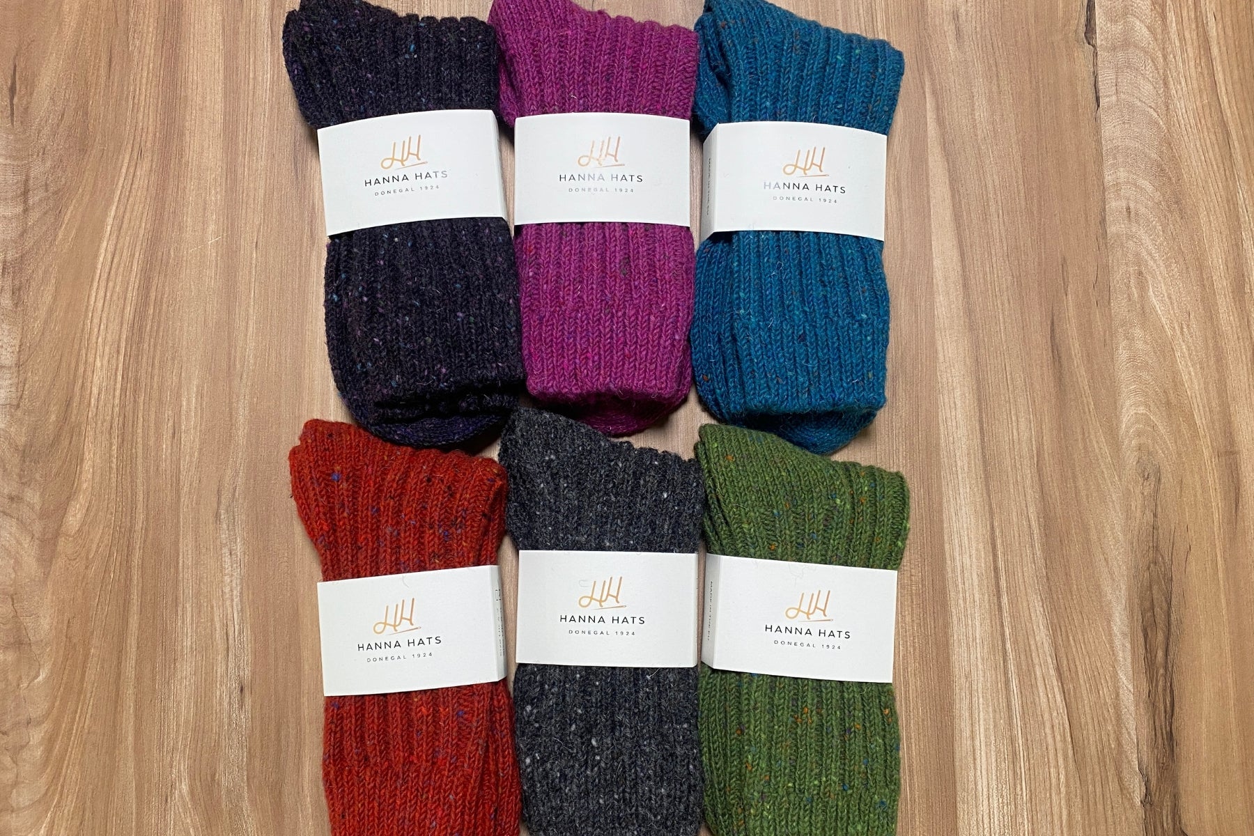 Sock-making is a traditional craft here in County Donegal, Ireland. These chunky woollen socks are made with nylon to ensure they stay up and maintain their shape, are ideal for hiking or lounging at home.